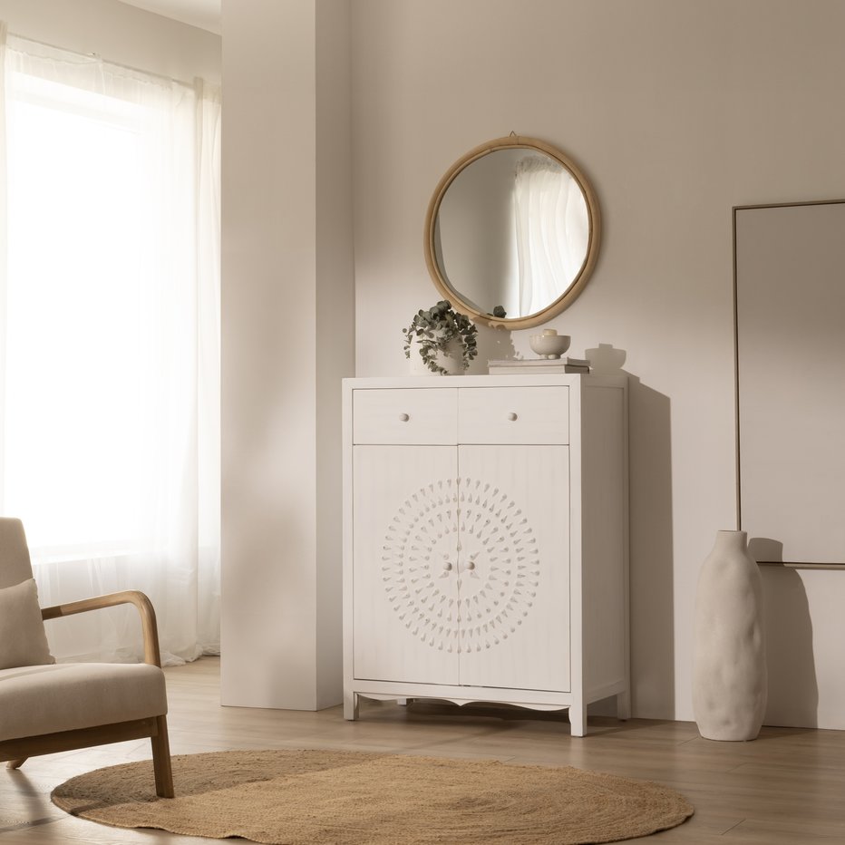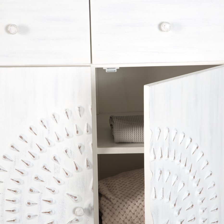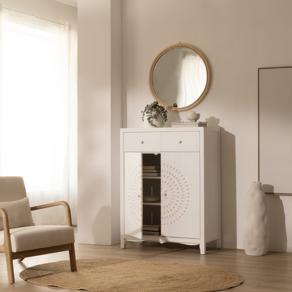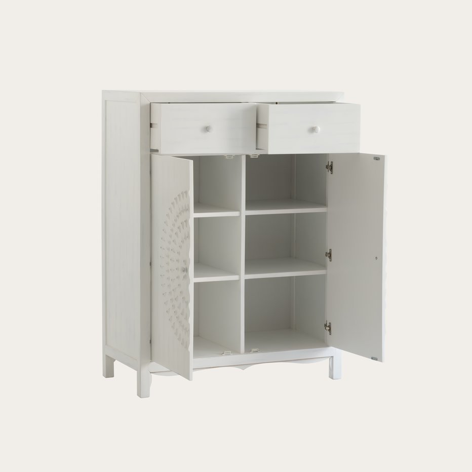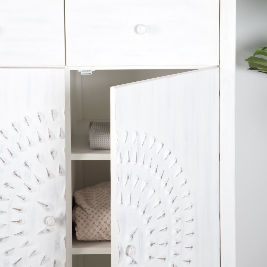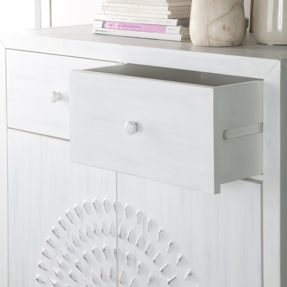 - El armario de la colección Delhi es la pieza que estabas buscando para ganar espacio de contención en casa. En acabado blanco antic y fabricado íntegramente en madera natural, este armario auxiliar cobra forma a partir de los dos cajones iguales que hay en la parte superior y una zona de vitrina, con puertas de madera en la parte inferior, cuyo interior está dividido por dos baldas. Sus dimensiones, 90 x 45 x 120cm, dan como resultado un mueble práctico y funcional, fácil de integrar en cualquier estancia. El elemento diferenciador a nivel estético viene de la mano del rosetón tallado en madera que decora el frontal del mueble. Fíjate también en el elemento decorativo que viste el zócalo de la pieza.