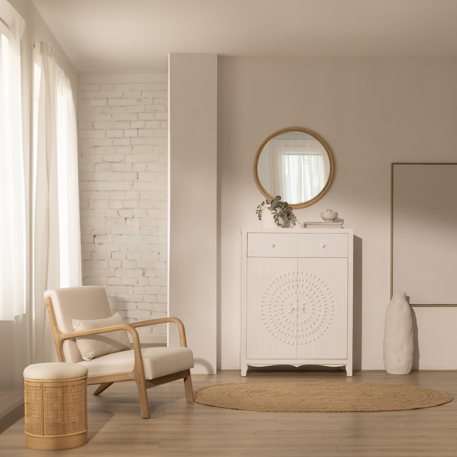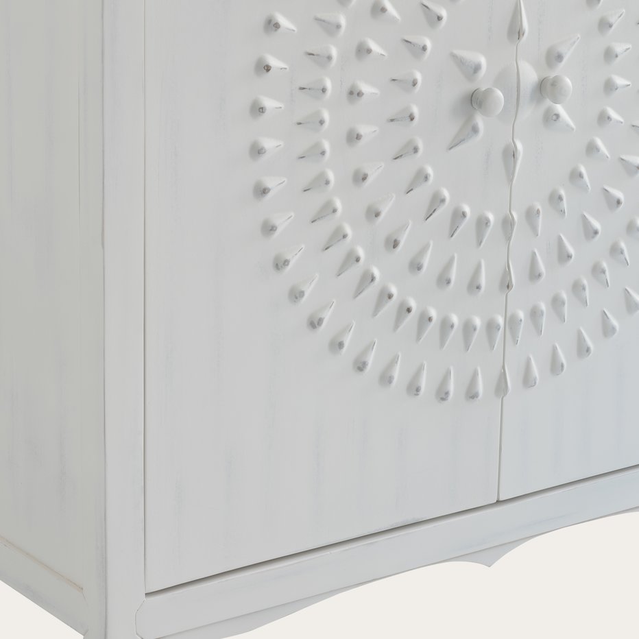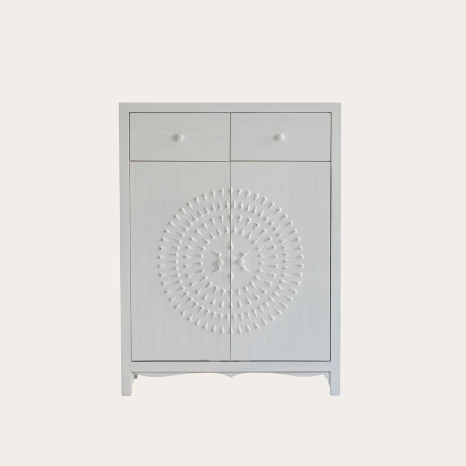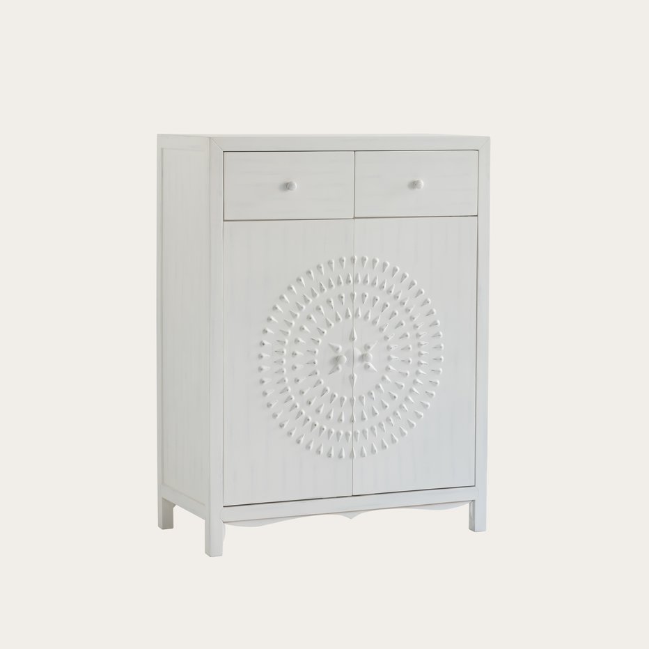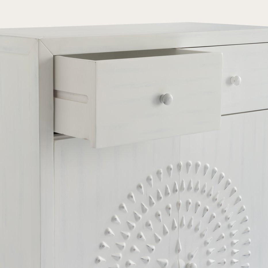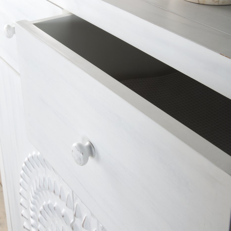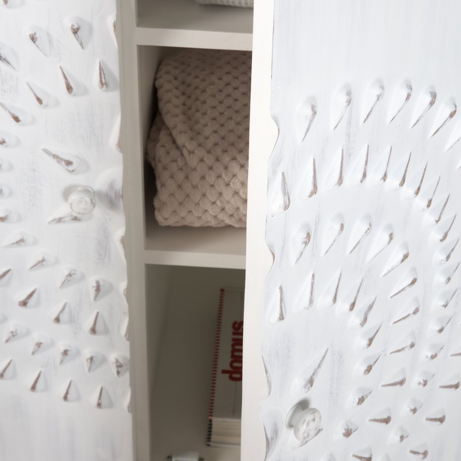 - El armario de la colección Delhi es la pieza que estabas buscando para ganar espacio de contención en casa. En acabado blanco antic y fabricado íntegramente en madera natural, este armario auxiliar cobra forma a partir de los dos cajones iguales que hay en la parte superior y una zona de vitrina, con puertas de madera en la parte inferior, cuyo interior está dividido por dos baldas. Sus dimensiones, 90 x 45 x 120cm, dan como resultado un mueble práctico y funcional, fácil de integrar en cualquier estancia. El elemento diferenciador a nivel estético viene de la mano del rosetón tallado en madera que decora el frontal del mueble. Fíjate también en el elemento decorativo que viste el zócalo de la pieza.