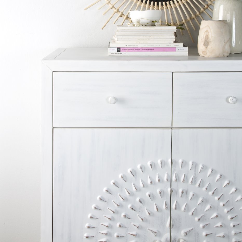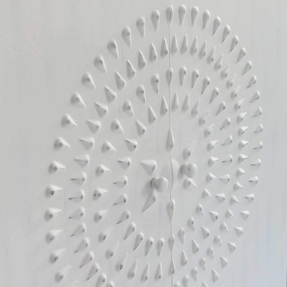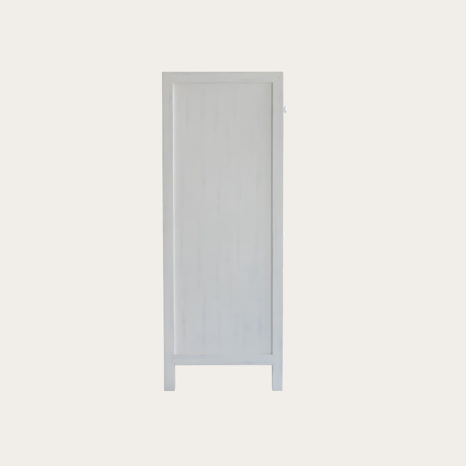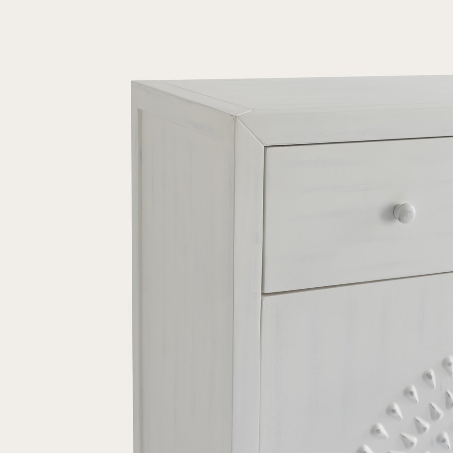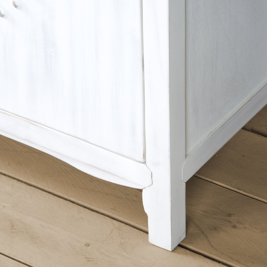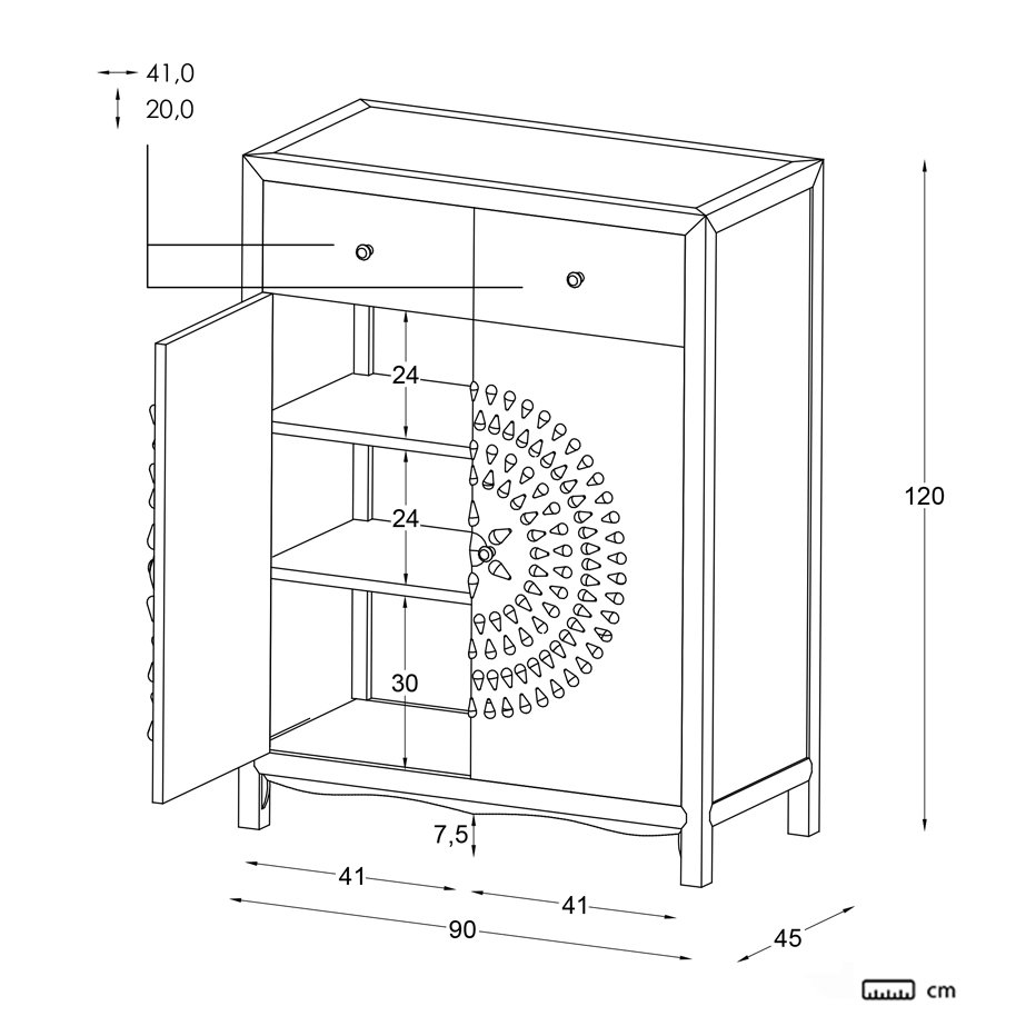 - El armario de la colección Delhi es la pieza que estabas buscando para ganar espacio de contención en casa. En acabado blanco antic y fabricado íntegramente en madera natural, este armario auxiliar cobra forma a partir de los dos cajones iguales que hay en la parte superior y una zona de vitrina, con puertas de madera en la parte inferior, cuyo interior está dividido por dos baldas. Sus dimensiones, 90 x 45 x 120cm, dan como resultado un mueble práctico y funcional, fácil de integrar en cualquier estancia. El elemento diferenciador a nivel estético viene de la mano del rosetón tallado en madera que decora el frontal del mueble. Fíjate también en el elemento decorativo que viste el zócalo de la pieza.